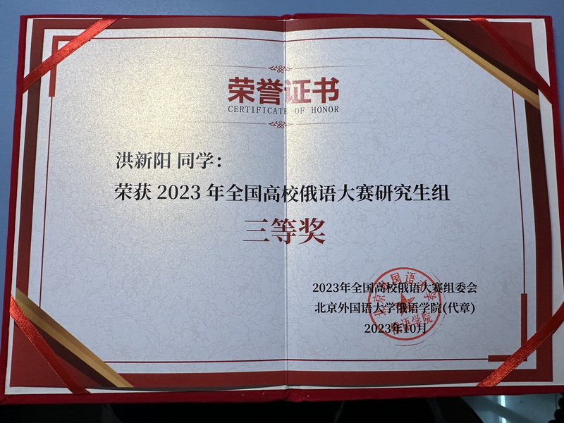 我院23级研究生洪新阳获得全国高校俄语大赛三等奖及留学基金委资助名额