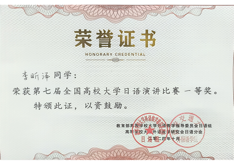 10月19日,由教育部高等学校大学外语教学指导委员会日语组、高等学校大学外语教学研究会日语分会主办的“第七届全国高校大学日语演讲比赛”在西南大学圆满落下帷幕。本次大赛吸引了来自全国50余所高校的精英学子同场竞技。在这场高水平的激烈角逐中,我校bet365亚洲官网 英语专业2021级的李昕泽同学脱颖而出,荣获一等奖(第一名),为北师大bet365亚洲官网 再添荣誉。这是继去年我校学子参加大赛以来,北师外文再次获此殊荣。